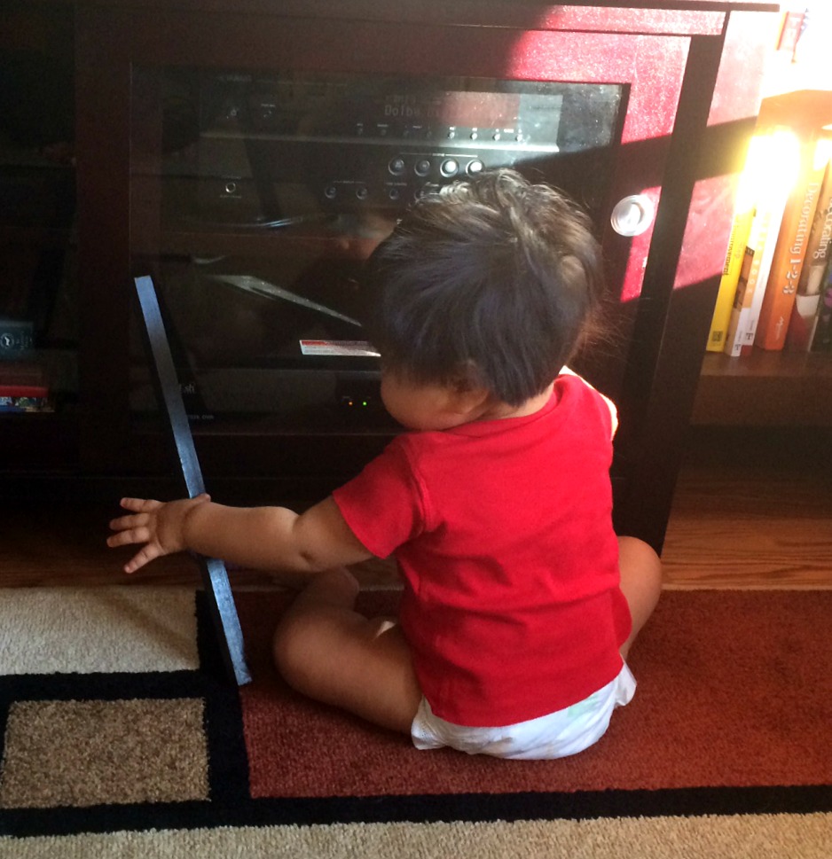 Mac and I had a fantastic idea for updating our tiny living room and making things safer for Baby. We would move bookshelves, anchor them into the wall, then put the new TV entertainment center between them. This would solve one problem we have had with keeping everything safe– the baby wouldn’t be able to crawl around the sides or back. We would then put all of the components behind glass so he can’t stick his chubby little fingers into all of the slots/inputs/outputs/shotputs. This was entirely Mac’s territory and he did his job well. Except for one, tiny detail.